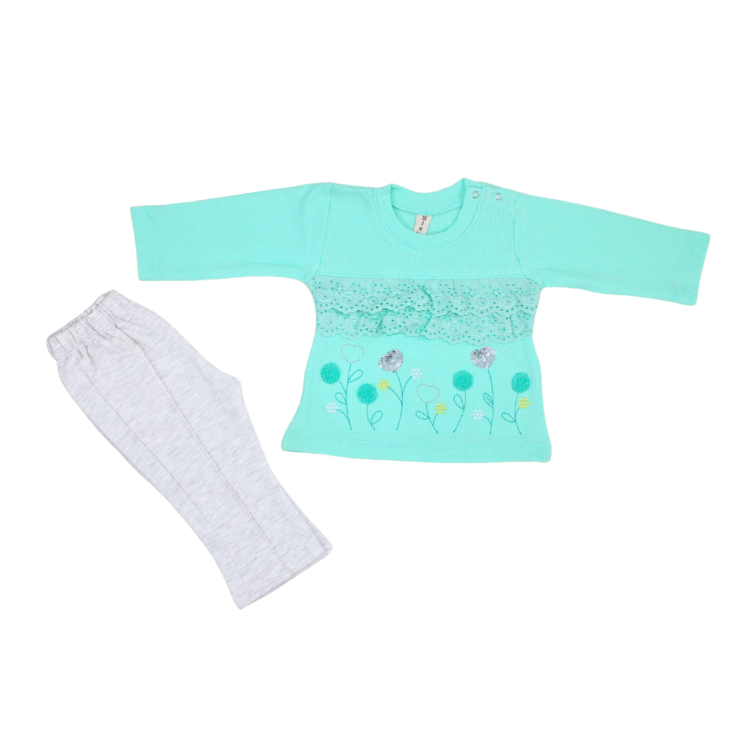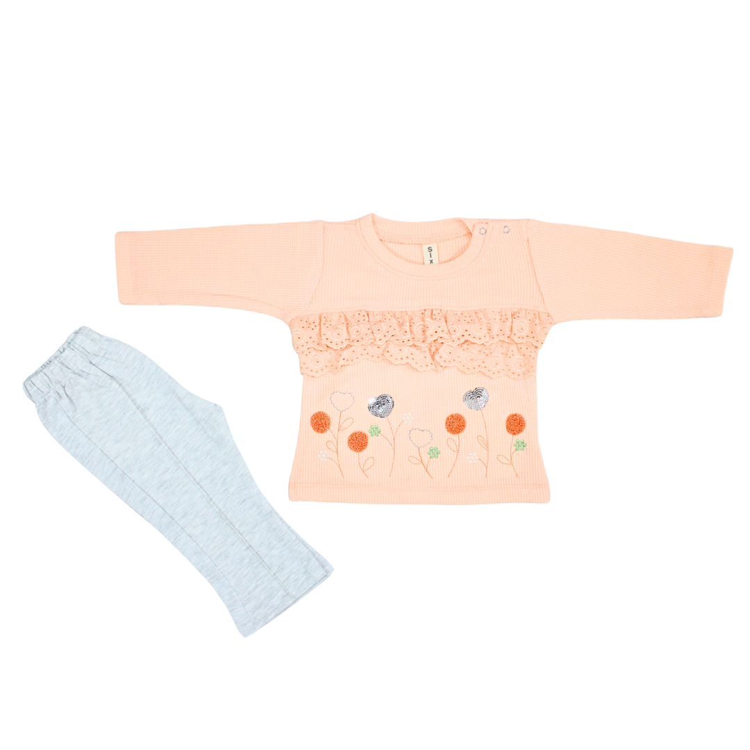 Keep your little one warm and stylish this winter with this adorable 2-piece outfit. The soft pink embroidered top with lace ruffle detail pairs perfectly with cozy gray leggings, offering both comfort and charm. Designed for ages 9-12 months and 12-18 months. this set is perfect for chilly days, casual outings, or as a thoughtful gift.