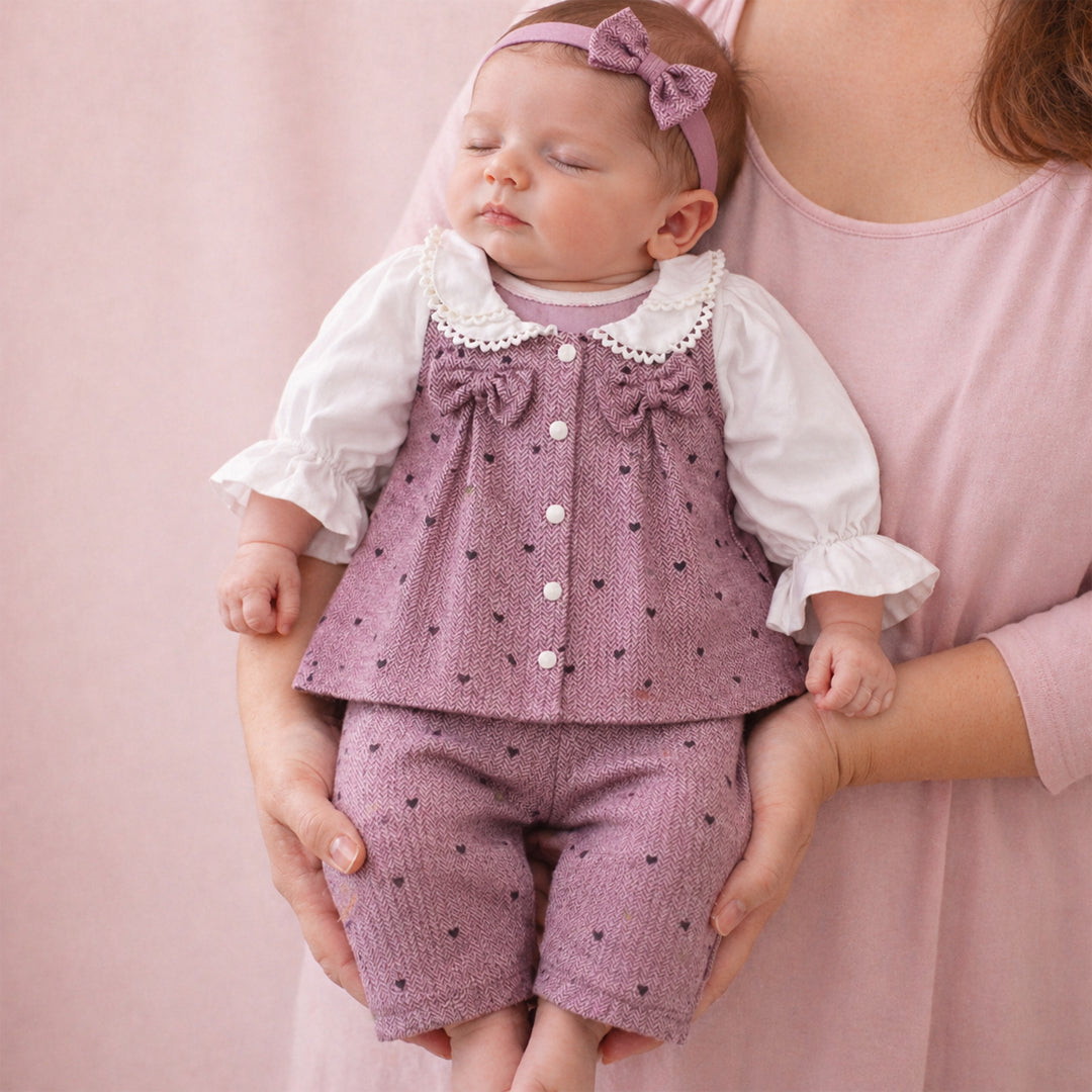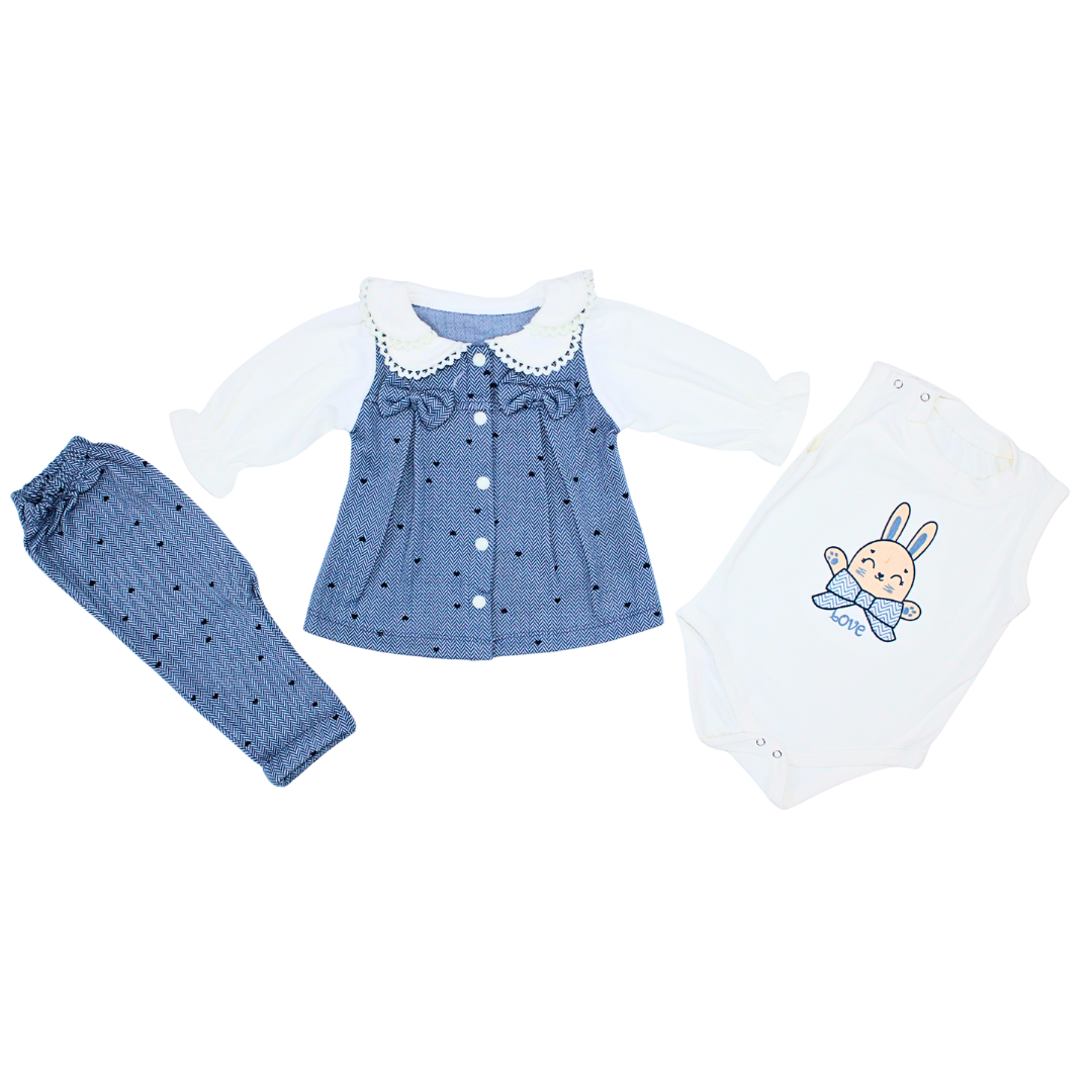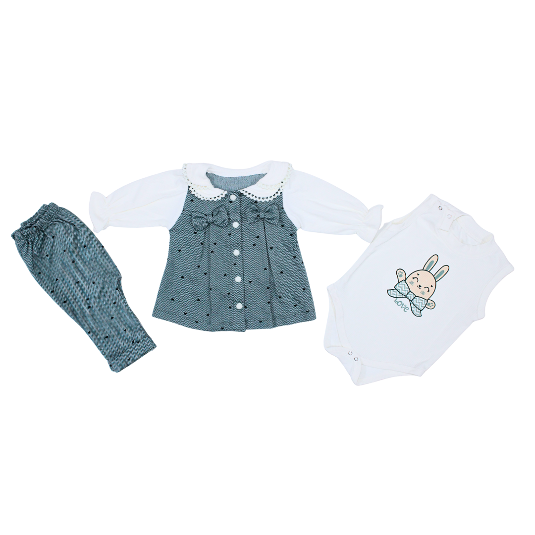 Keep your little one warm and stylish this winter with our premium 3-piece infant girls’ outfit, designed for newborns. This adorable set features a soft cotton bodysuit with a playful bunny print, a charming pink tunic detailed with a delicate lace collar and bow accent, and cozy leggings that complete the look. Crafted with love and care, this outfit ensures all-day comfort while keeping your child looking picture-perfect during winter outings, family gatherings, or casual wear.